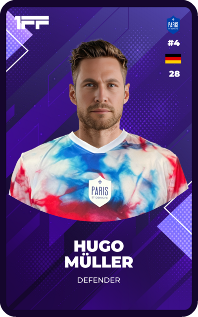Hugo Müller is a 28-year-old centre-back from Munich, Germany. Born in the area of Schwabing-West, he grew up playing football in the streets with his friends. On the pitch, he is a strong presence at the back, standing at 186cm and weighing 88kg. He is regarded as the best in the league at breaking up attacks and is particularly strong at marking and tackling. He is very short-tempered and tends to get in trouble with referees quite a bit. Müller enjoys living and playing in Europe and finds the French culture similar to the German one in many ways. He and his girlfriend Bibi are very happy in Paris, where they have settled into the city's vibrant atmosphere. Off the pitch, Müller is a studious person who analyses all his games in detail, always striving to improve his performance. He is quite conservative in his views and finds ‘wokeness’ to be incredibly frustrating. He lives in Saint-Ouen, Paris.